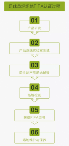 FIFA認(rèn)證過程 包括產(chǎn)品研發(fā)、測試、鋪裝、后期維護(hù)等6個步驟,是針對整個場地體系的認(rèn)證。