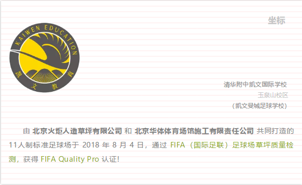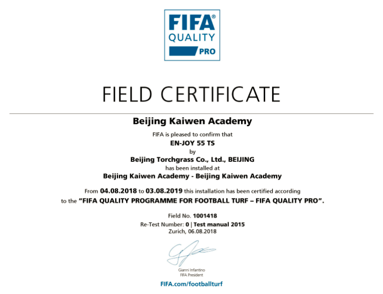 FIFA Quality Pro 是 FIFA國(guó)際足聯(lián) 認(rèn)證標(biāo)準(zhǔn)足球場(chǎng)。獲得FIFA Quality Pro認(rèn)證的證書(shū)場(chǎng)地?fù)碛谐薪覨IFA級(jí)別賽事的資格。