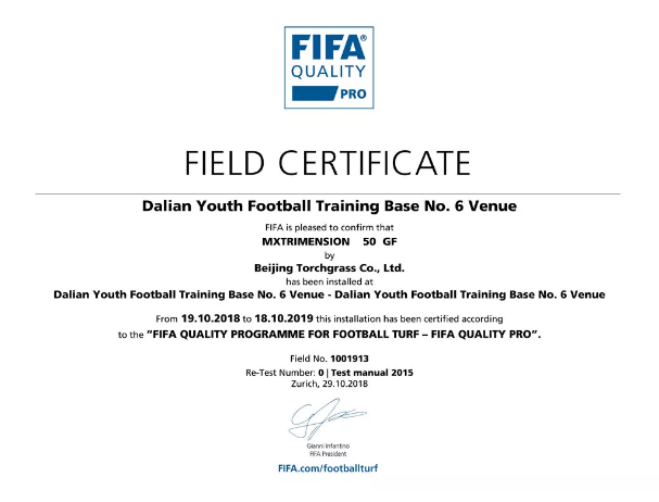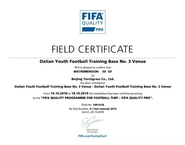 由 北京火炬生地人造草坪有限公司與大連嘉遠(yuǎn)體育工程有限公司共同打造的, 大連市青少年足球訓(xùn)練基地3號、6號足球場地,順利通過 FIFA(國際足聯(lián))足球場草坪質(zhì)量檢測,獲得 FIFA Quality Pro 認(rèn)證!