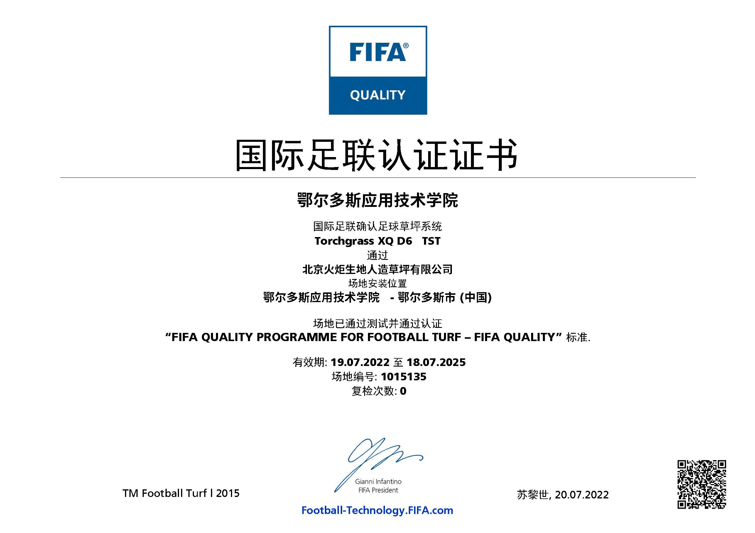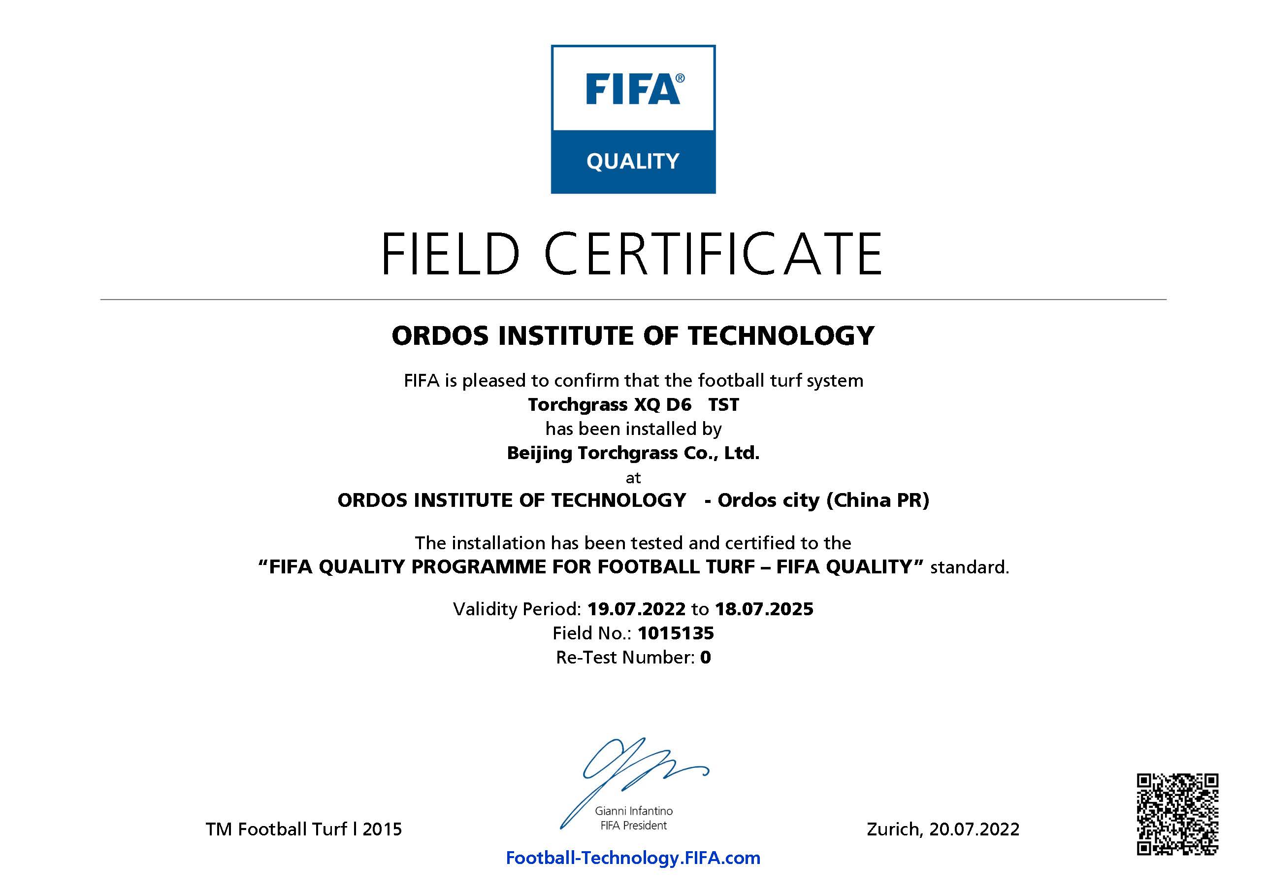近日,鄂爾多斯應(yīng)用技術(shù)學(xué)院足球場地已通過 FIFA(國際足聯(lián))人造草坪足球場地質(zhì)量檢測,榮獲 FIFA Quality認(rèn)證證書。