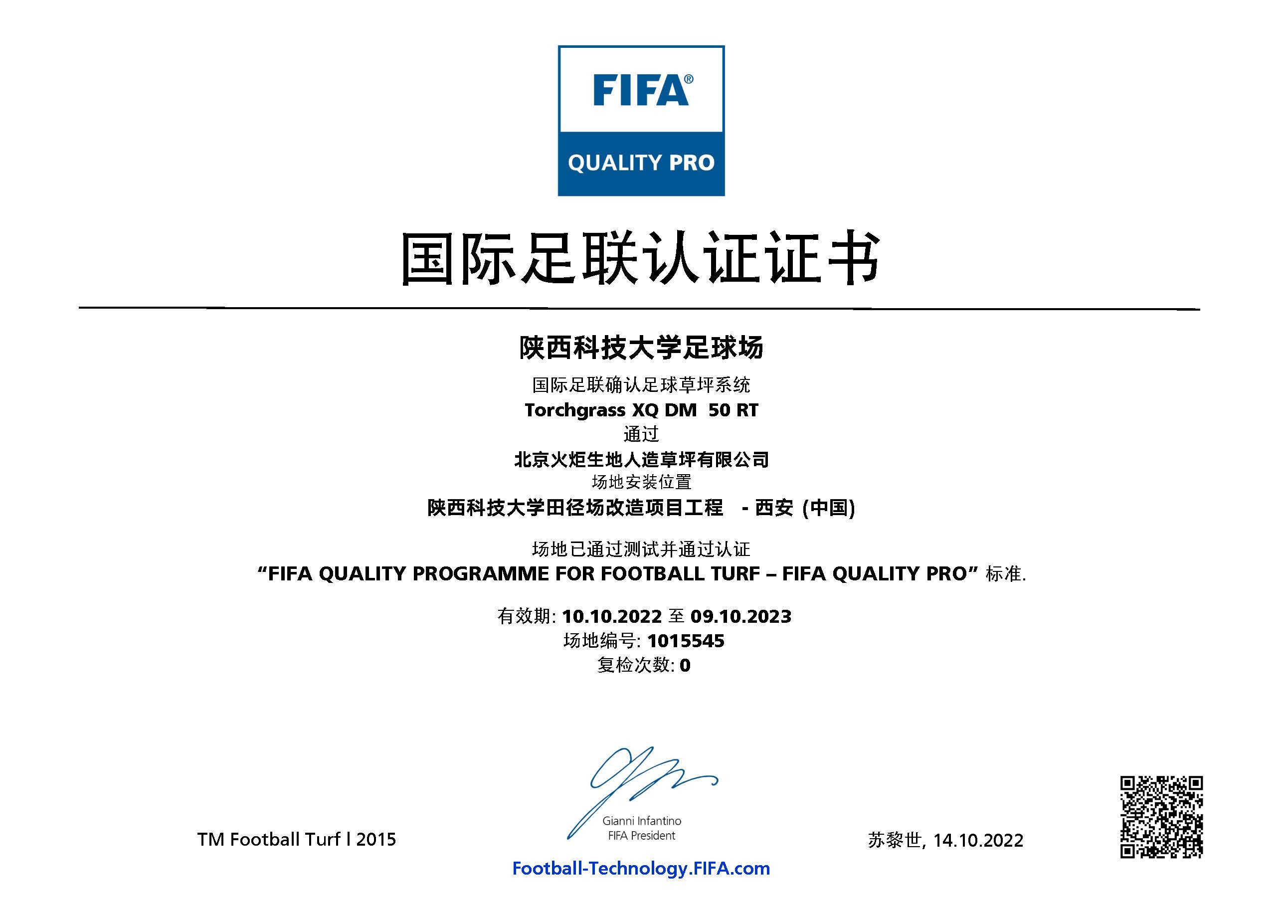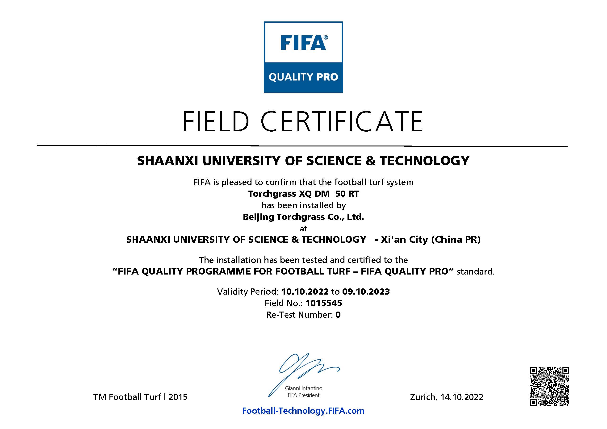 近日,陜西科技大學(xué)足球場已通過 FIFA(國際足聯(lián))人造草坪足球場地質(zhì)量標(biāo)準(zhǔn)的測試,榮獲 FIFA Quality PRO認證證書。