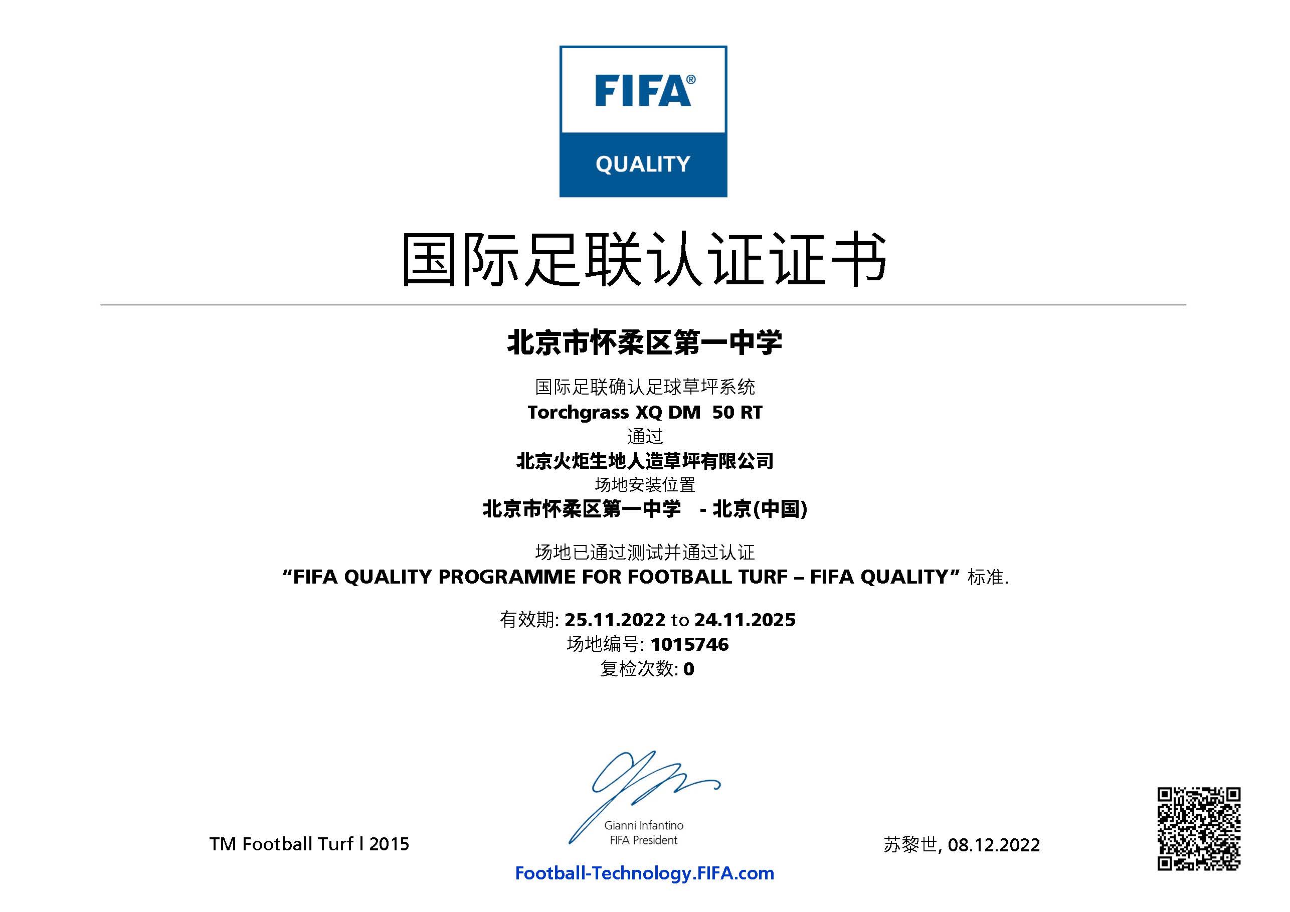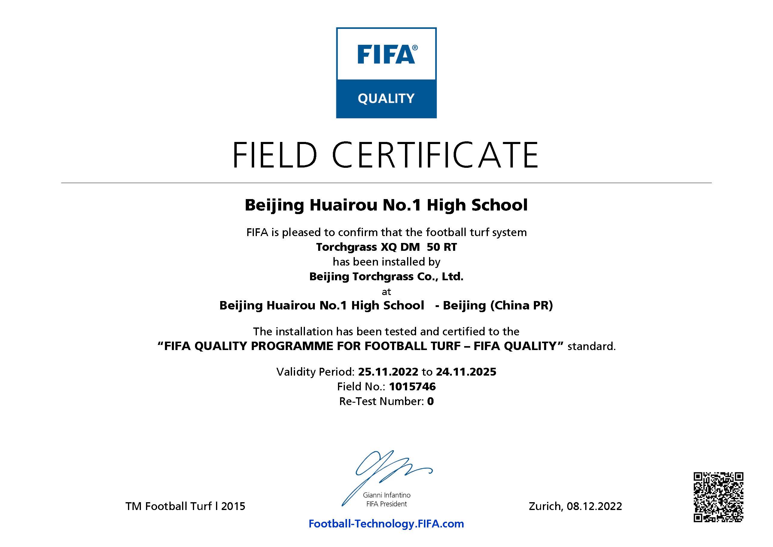 近日,北京市懷柔區(qū)第一中學(xué)足球場(chǎng)已通過(guò) FIFA(國(guó)際足聯(lián))人造草坪足球場(chǎng)地質(zhì)量標(biāo)準(zhǔn)的測(cè)試,榮獲 FIFA Quality 認(rèn)證證書(shū)。