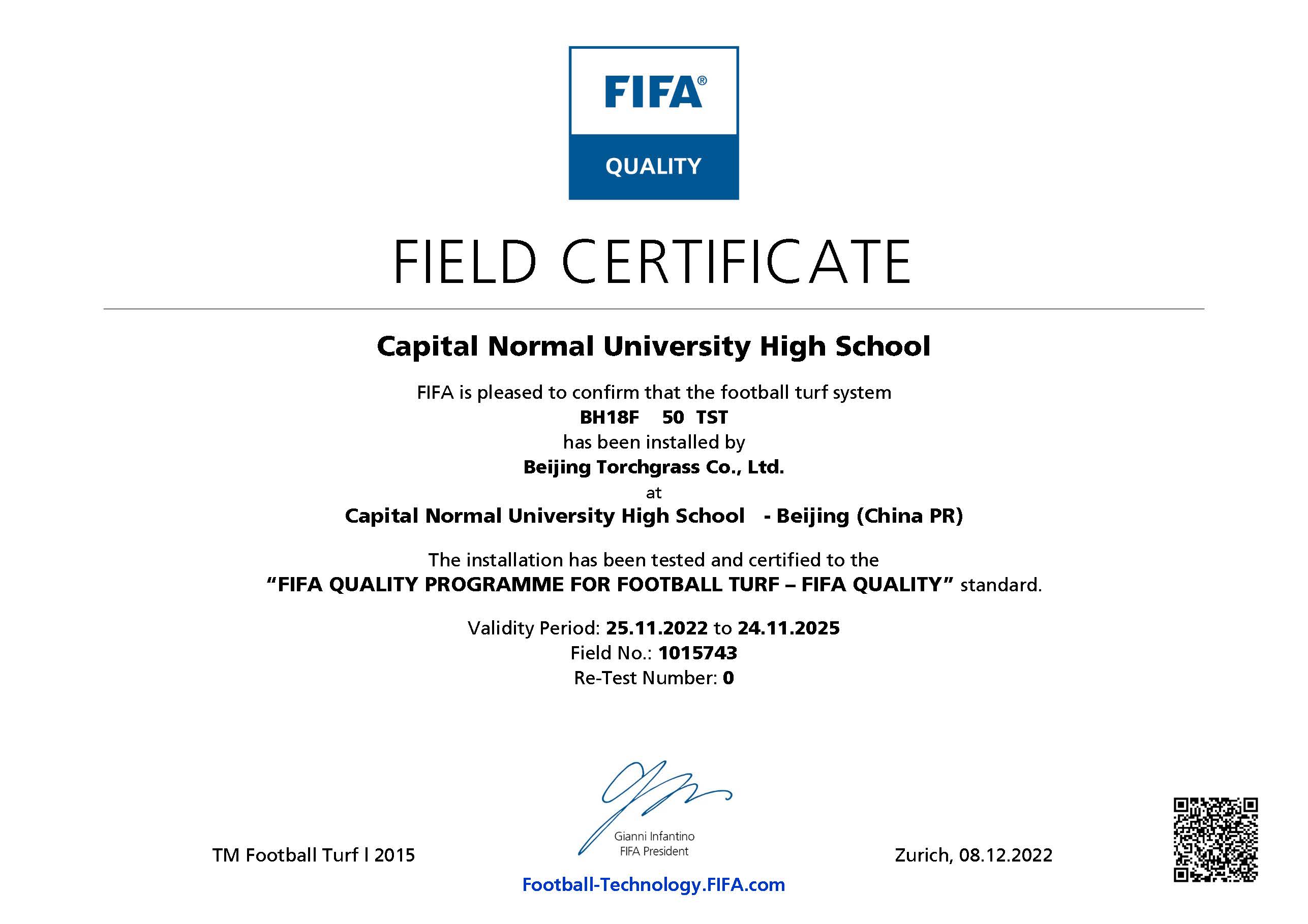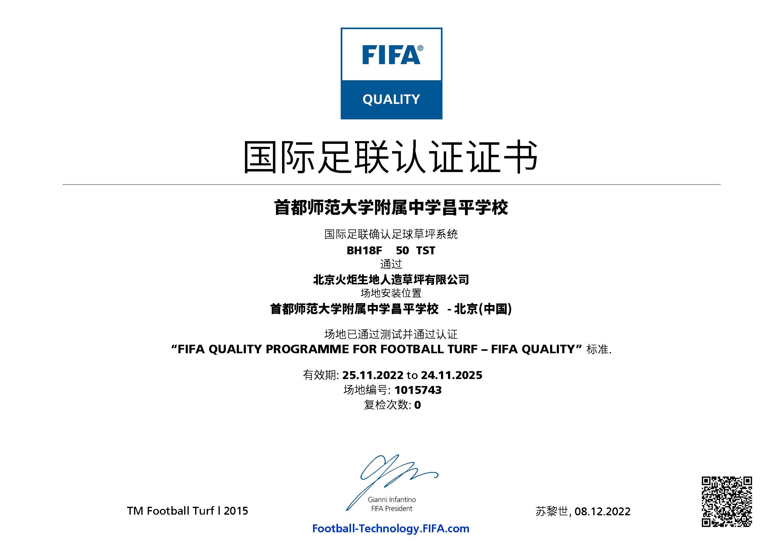近日,首都師范大學(xué)附屬中學(xué)昌平學(xué)校足球場已通過 FIFA(國際足聯(lián))人造草坪足球場地質(zhì)量標準的測試,榮獲 FIFA Quality 認證證書。