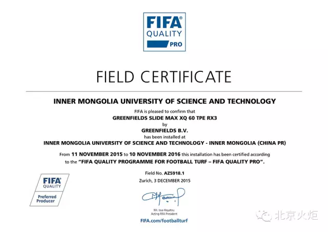 內(nèi)蒙古科技大學(xué)FIFA二星場地認證證書